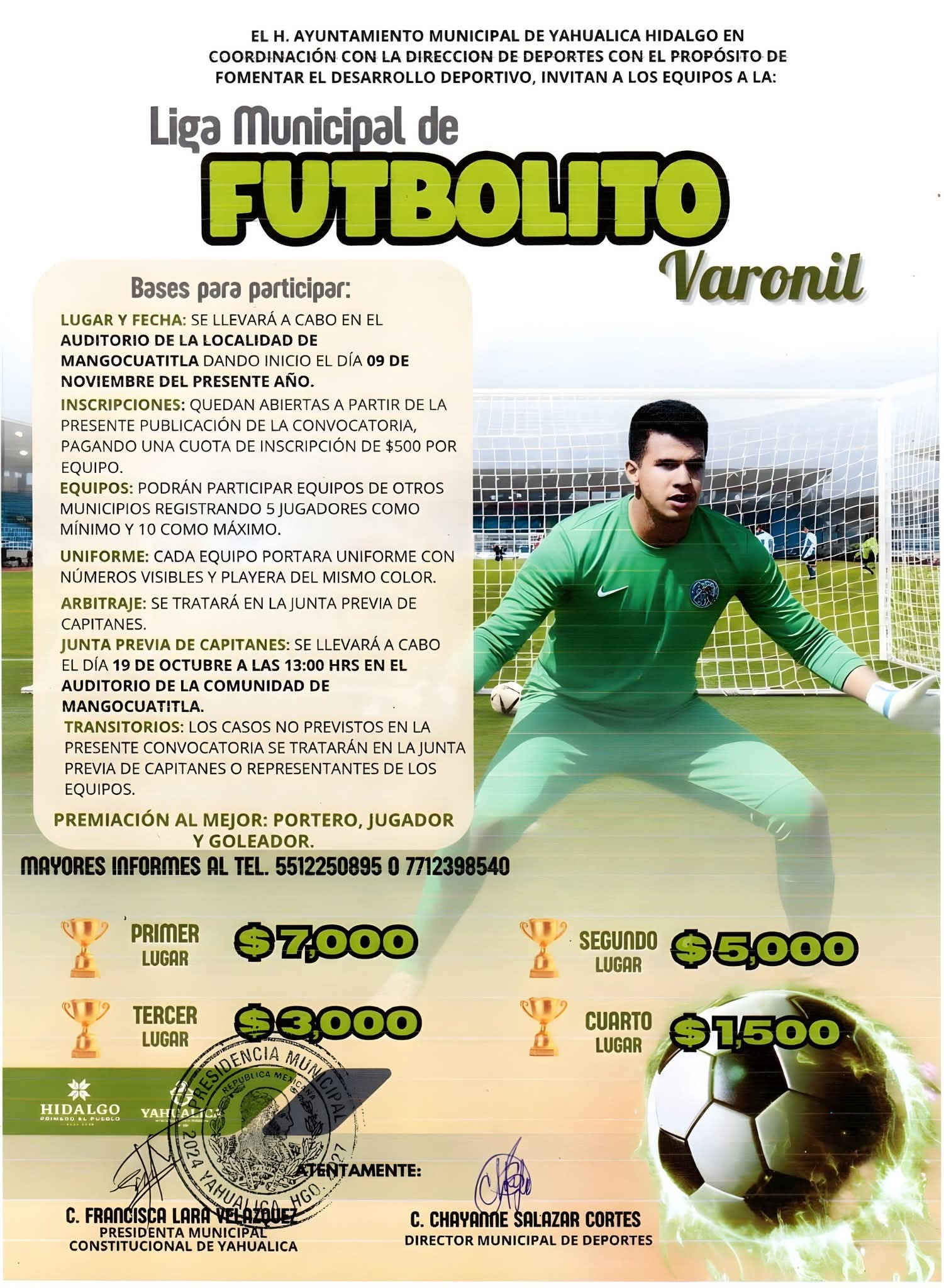 Yahualica, Hgo.- Con el firme compromiso de impulsar el deporte y fomentar la sana convivencia entre jóvenes y adultos en todo el municipio, la Presidenta Municipal Francisca Lara Velázquez, junto a la Presidenta del Sistema DIF Municipal Arisbeth Hernandez Lara, y en coordinación con el área de Deportes, anunciaron con gran entusiasmo el inicio de la Liga Municipal de Futbolito Varonil en Mangocuatitla.