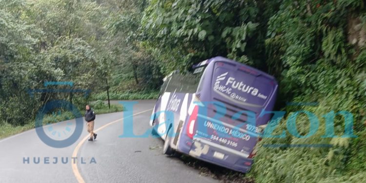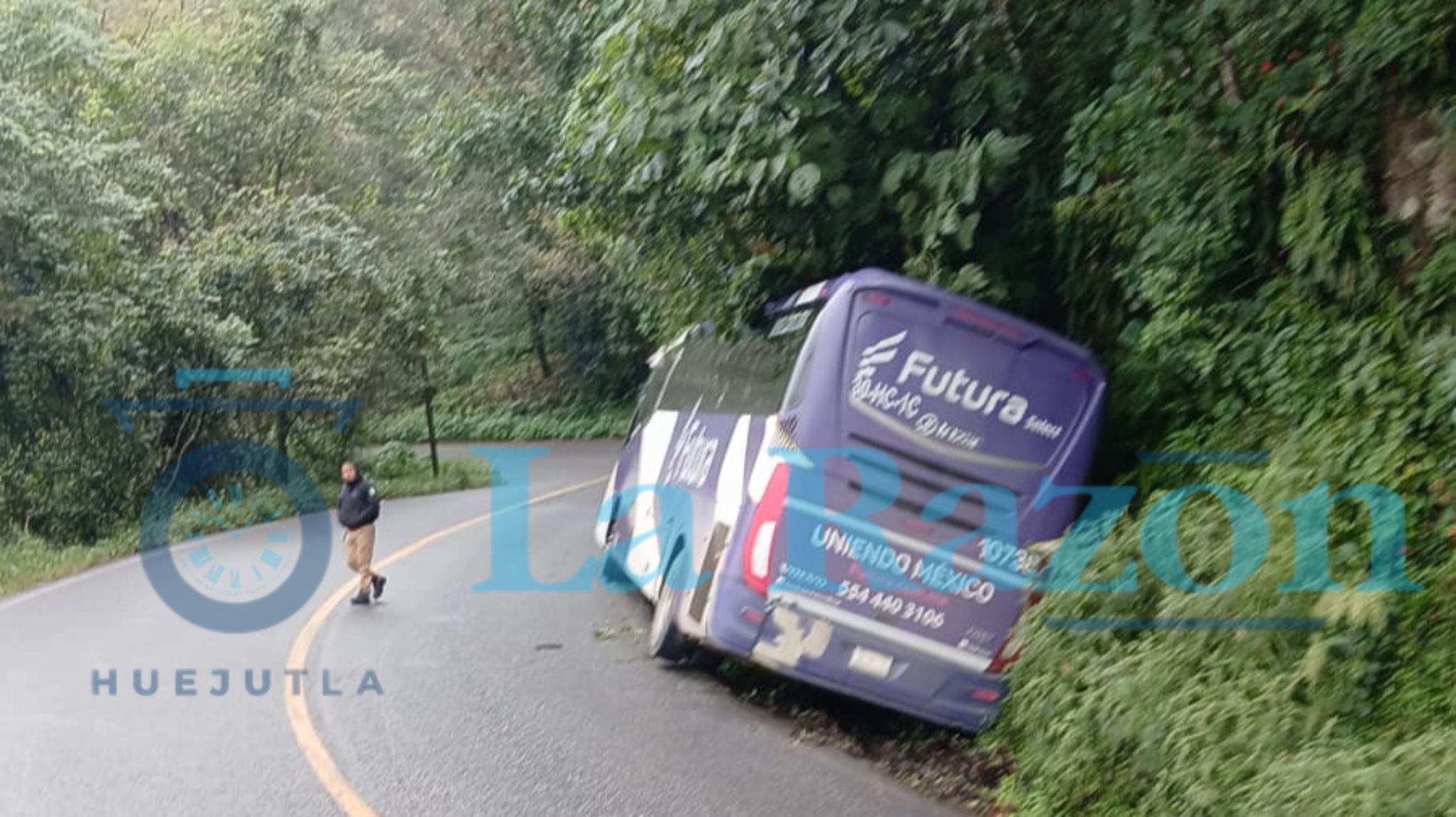 Tlanchinol, Hgo. – Un autobús de la línea Futura que circulaba sobre la carretera federal México–Tampico terminó fuera de la carpeta asfáltica, luego de que presuntamente un tráiler invadiera su carril.