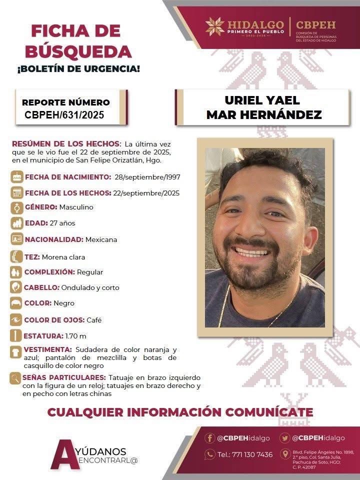 La Comisión de Búsqueda de Personas del Estado de Hidalgo emitió la ficha de localización y se mantienen las investigaciones para dar con su paradero.