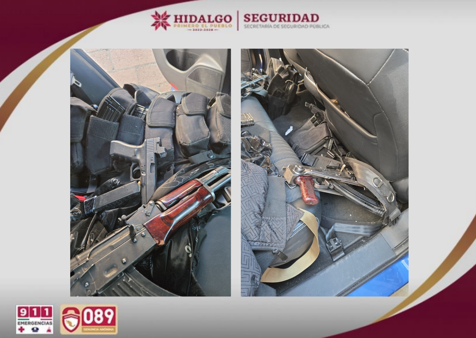 Como resultado del seguimiento, uno de los vehículos vinculados a la agresión fue localizado sobre la carretera Tula–Jorobas, donde se registró un enfrentamiento armado. Durante la intervención, fueron asegurados dos sujetos que viajaban a bordo de una camioneta Explorer blanca, ambos originarios del estado de Campeche.