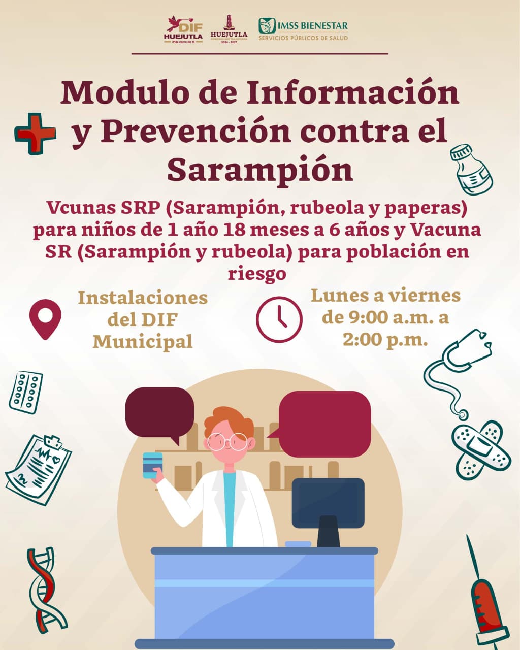 Huejutla, Hgo.- El DIF Huejutla, presidido por la Dra. Kristel Rodríguez Flores, en coordinación con el Gobierno Municipal que encabeza el Lic. Alfredo San Román e IMSS Bienestar, anunció la habilitación del Módulo de Información y Prevención contra el Sarampión, a fin de salvaguardar la salud de los grupos en situación de riesgo.