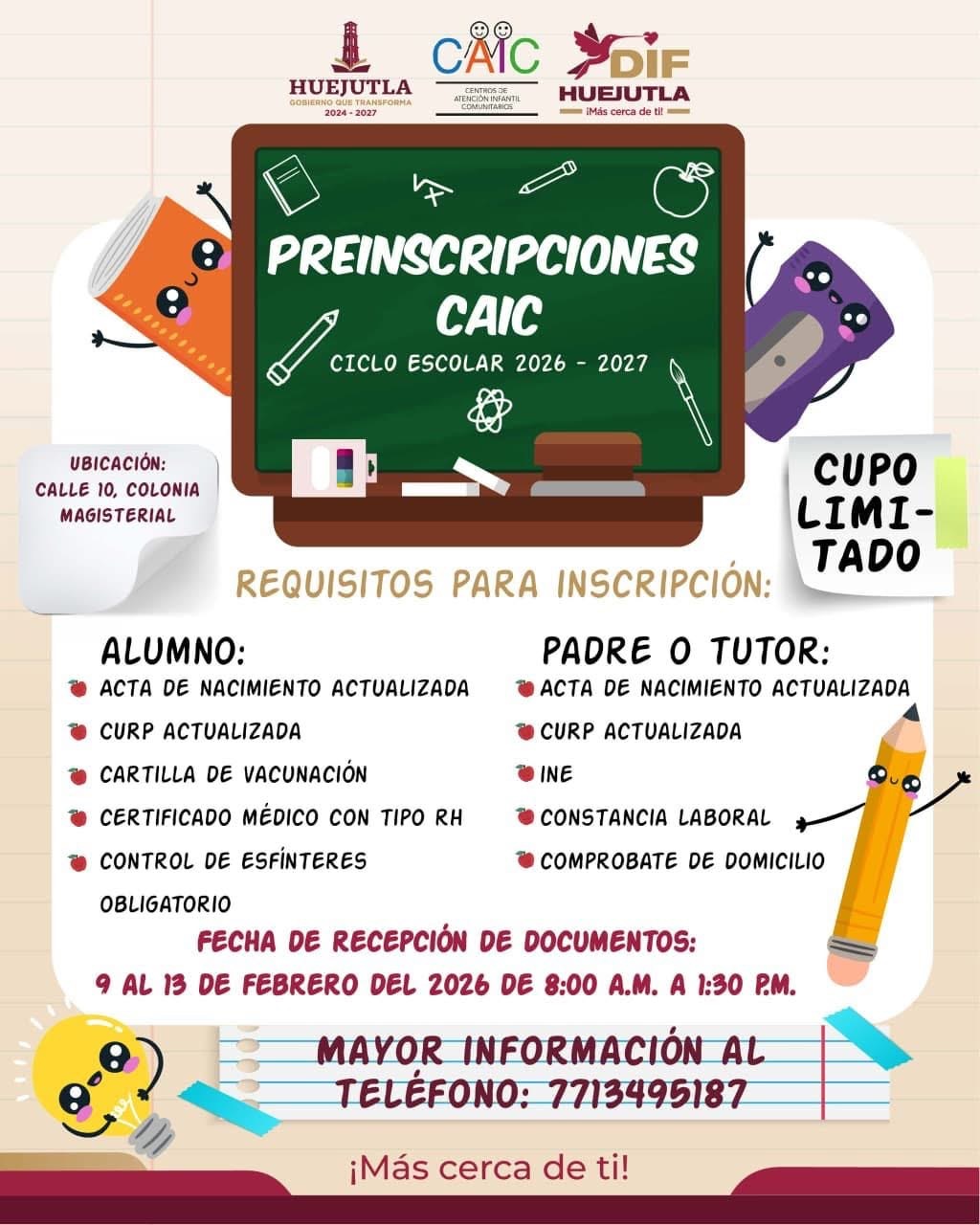 Huejutla, Hgo.- El Sistema DIF Municipal Huejutla, presidido por la Dra. Kristel Rodríguez Flores, dio a conocer las fechas del periodo de preinscripciones para el ciclo escolar 2026 – 2027 en el Centro de Atención Infantil Comunitario, CAIC.