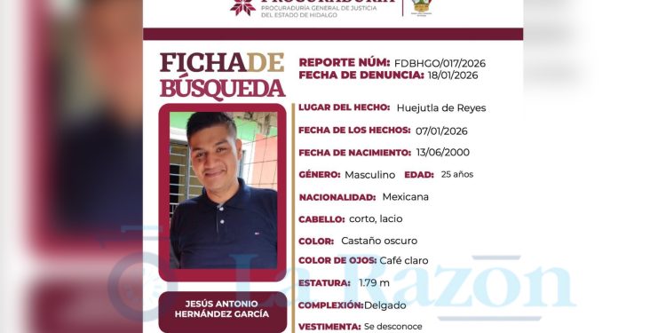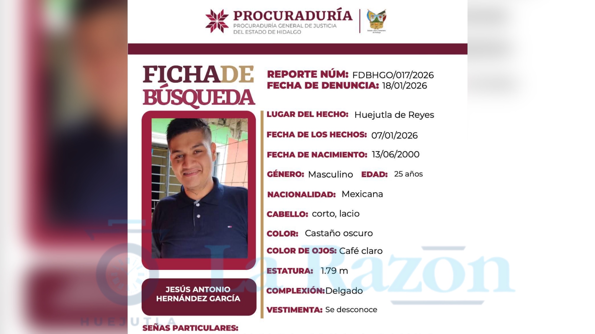 De acuerdo con la ficha de búsqueda con número de reporte FDBHGO/017/2026, emitida por la Procuraduría General de Justicia del Estado de Hidalgo (PGJEH), el hombre de 25 años de edad fue visto por última vez el 7 de enero de 2026 en esta ciudad, sin que hasta el momento se conozca su paradero.