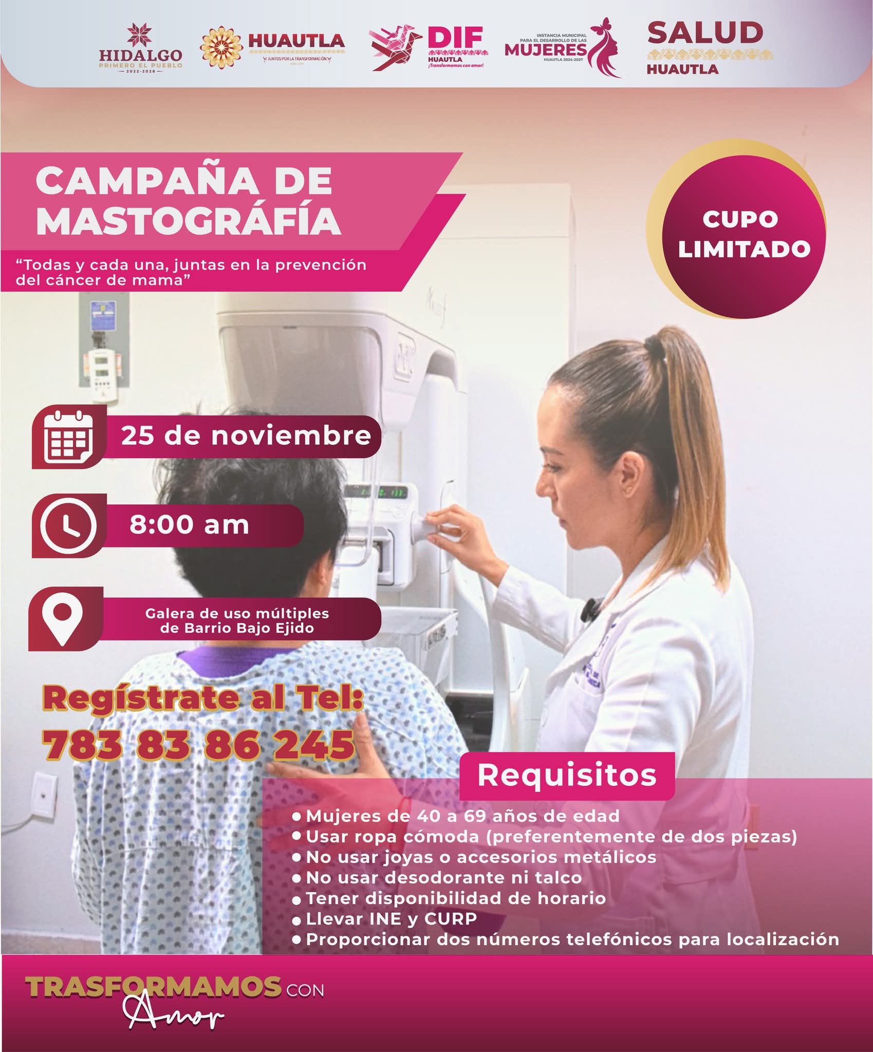 Huautla, Hgo.- El Sistema DIF Municipal, que preside la profra. Yadira Naranjo Ramírez en coordinación con el área de Salud Municipal y la Instancia Municipal para el Desarrollo de las Mujeres invitan a todas las mujeres a participar en la jornada de mastografías gratuitas en conmemoración del pasado mes rosa de sensibilización sobre el cáncer de mama.