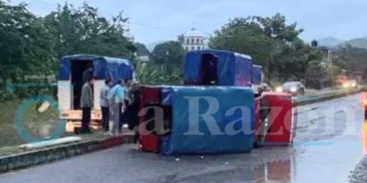 El percance ocurrió a la altura del acceso a la comunidad de Xiquila, donde la unidad terminó recostada sobre el pavimento, según los primeros informes.