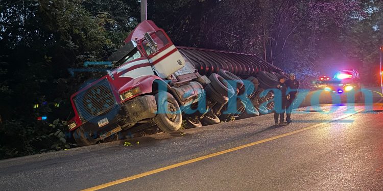 Por tratar de librar un bache, la pesada unidad terminó recostada a un lado de la vía federal la tarde de este martes.